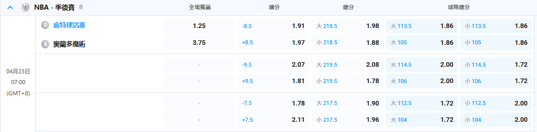雖然這是一場季後賽對決,但莊家卻開出了高達8.5分的深盤。這顯示莊家極度看好活塞在回到主場後能強勢反彈,發揮出應有的實力,並且預期魔術在客場會遭遇較大的進攻麻煩。