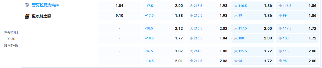 216.5分在現代籃球中不算太高,但大分賠率來到2.02。莊家預期雷霆會利用速度優勢拖垮太陽,且雷霆主場得分本來就很爆發。如果太陽在垃圾時間能換上板凳部隊稍微追分,總分要突破216.5並不困難。