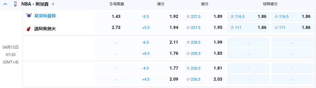 首先看熱火與黃蜂的決鬥,盤口開出黃蜂「讓5.5分」(賠率1.92)。雖然熱火剛在最終戰火力全開,但莊家顯然更看好黃蜂的主場優勢與近況,熱火受讓賠率來到1.94,這場順著莊家思路,下注黃蜂過盤是個穩健選擇。