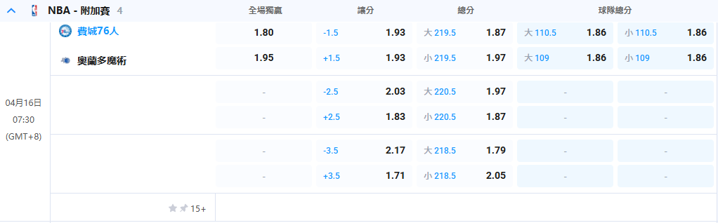 - 07:30 (8)奧蘭多魔術 vs. (7)費城76人