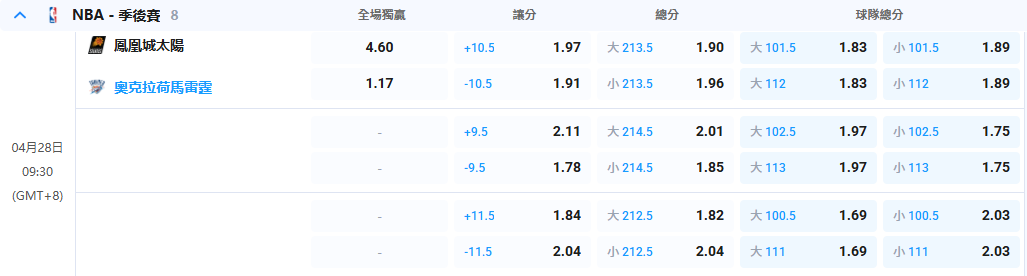 - 09:30 鳳凰城太陽 vs 奧克拉荷馬雷霆 (OKC 3-0 領先)