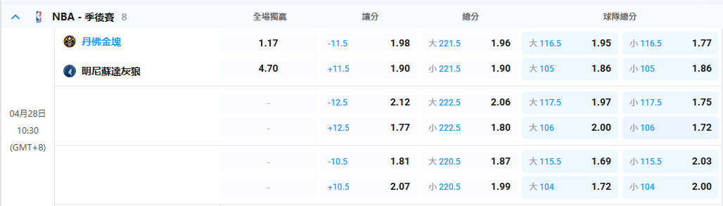 - 10:30 丹佛金塊 vs 明尼蘇達灰狼 (MIN 3-1 領先)