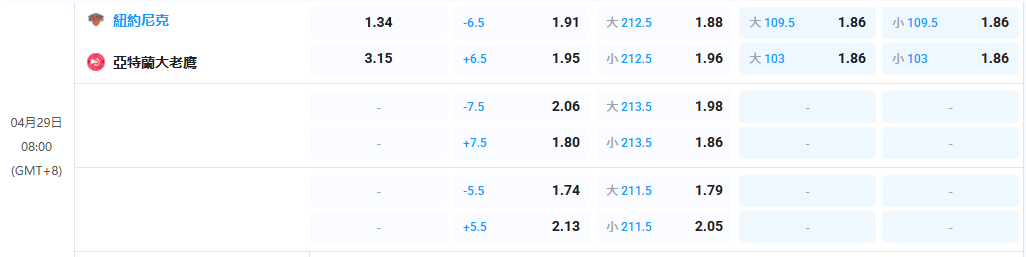 - 08:00 紐約尼克 vs 亞特蘭大老鷹 (2-2 平手)