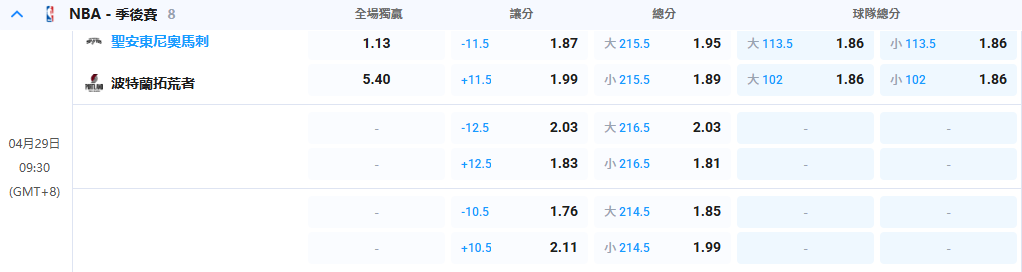 上半場先行制人(上半場讓分:馬刺 -7.5): 馬刺為了儘早奠定勝基,開局勢必會利用主場氣勢發起猛攻。拓荒者在客場開局往往需要熱機,面對斑馬的火鍋店開張,上半場很可能就會落後雙位數。7.5 分的讓步對於馬刺來說是一個非常合理的獲利區間。買「上半場聖安東尼奧馬刺讓 7.5 分」(賠率 1.96)。