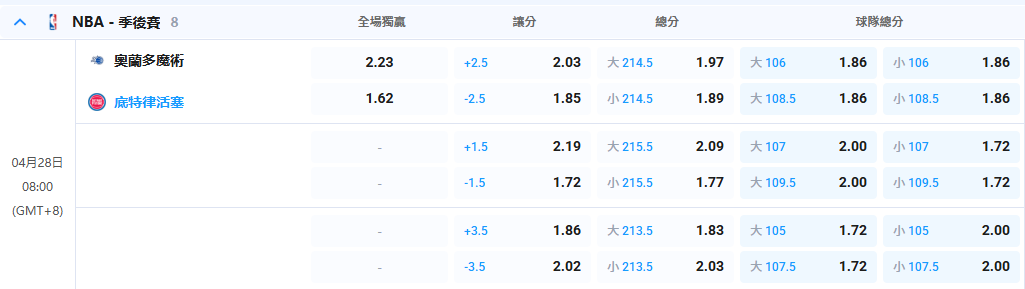 - 08:00 奧蘭多魔術 vs 底特律活塞 (ORL 2-1 領先)