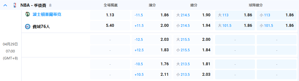 - 07:00 波士頓塞爾提克 vs 費城 76人 (BOS 3-1 領先)