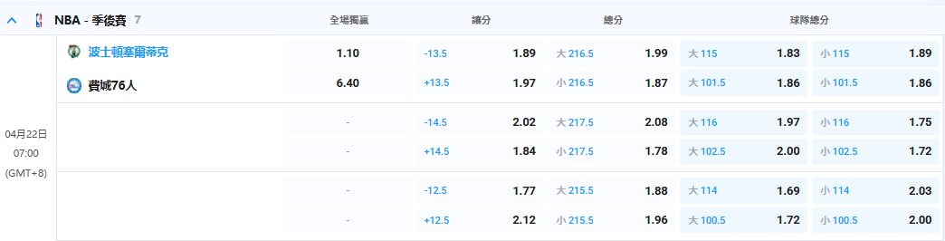 季後賽開出13.5分的深盤,這在東區準決賽等級的對戰中非常罕見!莊家之所以敢開這麼深,是因為首戰塞爾提克以20分之差血洗 76 人。76人在經歷附加賽死裡逃生後,體能明顯透支,面對綠衫軍的鐵血防守與「雙探花」的猛烈砲火,幾乎毫無招架之力。莊家預期這場比賽依舊會是一面倒的輾壓局。