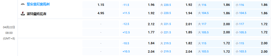 盤口數據: 馬刺「讓11.5分」(賠率1.96)
