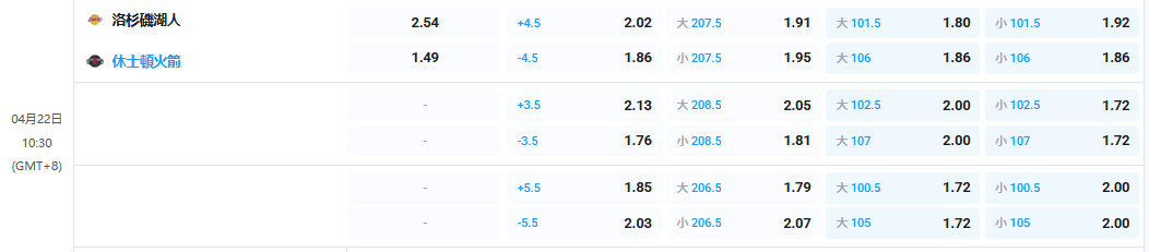 盤口數據: 火箭「讓4.5分」(賠率1.86) / 湖人「受讓4.5分」(賠率2.02)