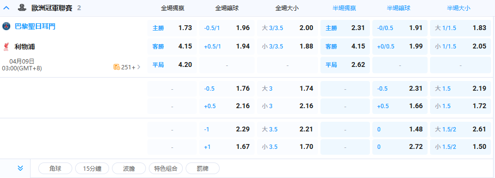 首先是巴黎聖日耳曼對決利物浦,根據最新開出的盤口,莊家稍微看好擁有主場優勢的巴黎,開出主勝1.73的獨贏賠率。在進階的足球運彩玩法中,全場讓球開出巴黎讓0.5/1 球(賠率 1.96),考慮到兩支球隊的進攻砲火都相當華麗,大小分盤口更是直接開到3/3.5。這時候參考專業的足球運彩分析,若看好雙方互轟,選擇高賠率的大分(2.00)絕對是個值得入手的突破口。