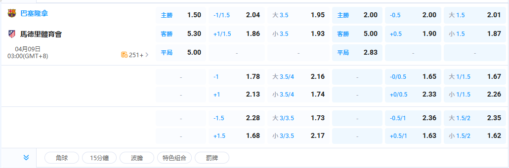 另一場焦點則是巴塞隆納迎戰馬德里體育會的西甲大內戰!莊家極度看好近期主場氣勢如虹的巴薩,獨贏賠率低到只有1.50。如果你想追求更高的獲利,一招超實用的足球運彩攻略 就是往讓球盤看:目前巴薩讓1/1.5球的賠率來到了非常香的2.04!只要賽前多關注足球分析預測,相信巴薩能在主場淨勝兩球以上的球迷,這絕對是高CP值的絕佳選擇!